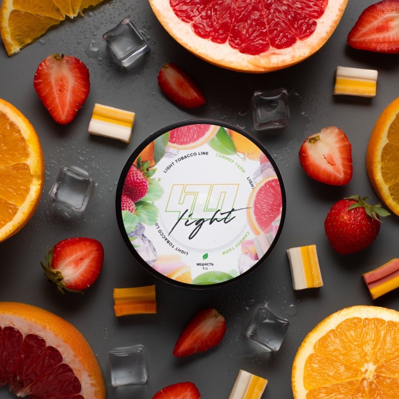Табак 420 light Саммер Тайм 100 гр - это смелое сочетание освежающей жвачки, кисло-сладких цитрусов и ягодного джема.