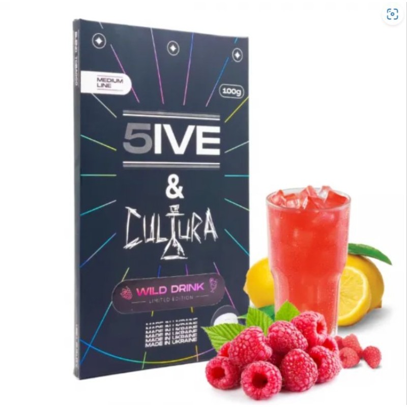 Кальянний тютюн 5IVE & Cultura Wild Drink 100g + 5g Cultura Бустер Міцності– насичений смак малинового лимонаду, верхні ноти ягоди ідеально доповнюють твою чашку в поєднанні з лимонадом, що освіжає.