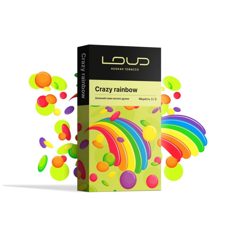 Тютюн Loud Crazy rainbow (Крейзі Рейнбоу, 100 г) - Цукерки, Мультифрукт 100 г від виробника Loud, це відмінне поєднання у смаку та кількості диму, де немає нічого зайвого. Бренд Loud має у своєму асортименті чималу кількість смаків, де є як і соло-смаки, так і мікси, які залишається просто забити в чашу та почати розслаблятися. Смак Цукерки, Мультифрукт - вважається вкрай поширеним у димних колах. Компанія Loud створює виключно тютюн для високоякісного кальяну, створений з натуральних продуктів без використання хімічно небезпечних для людини речовин. Користувачі отримують поєднання густого диму з яскравим смаком та релакс від спокійного проведення часу без головного болю на ранок.